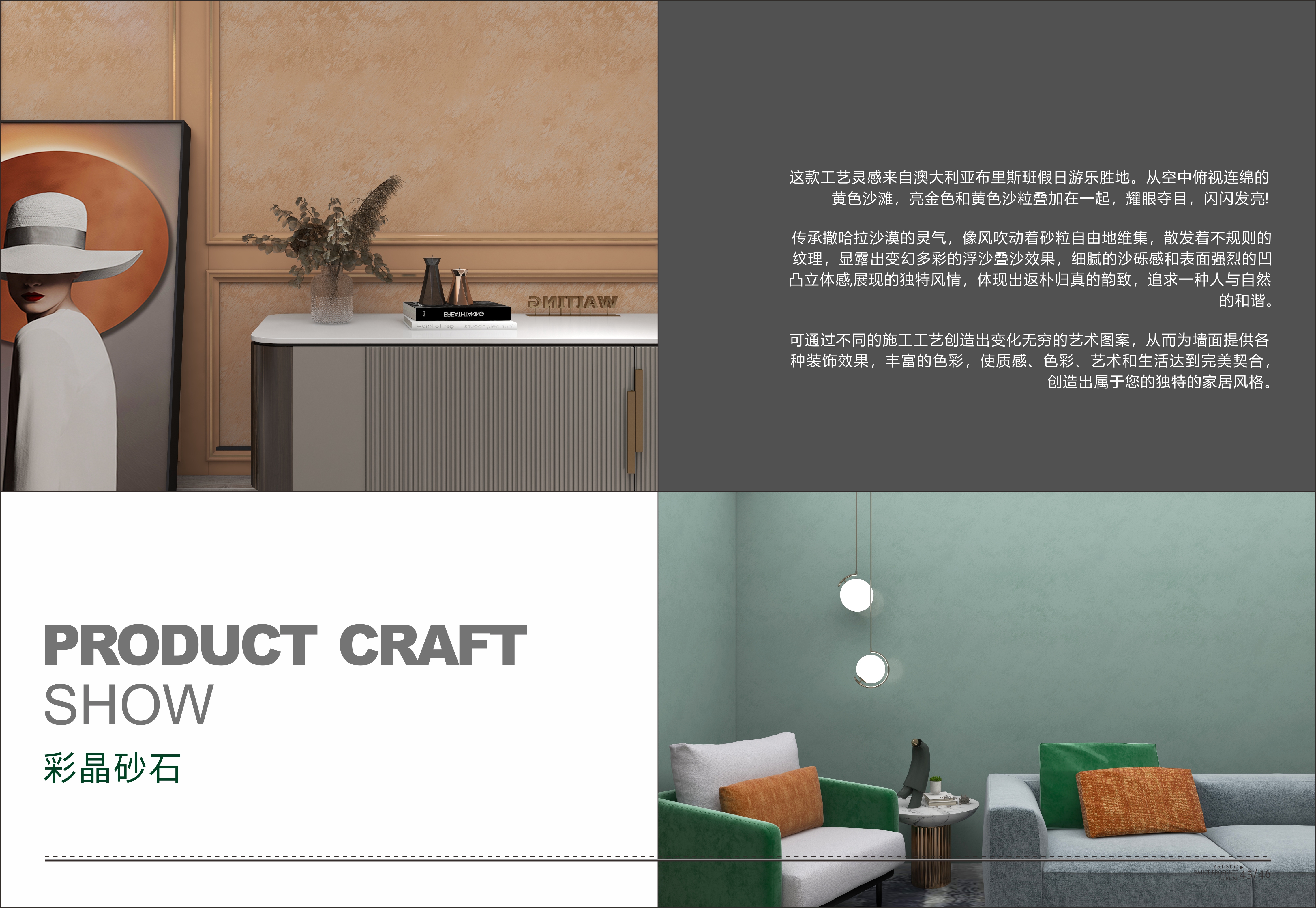 彩晶砂石系列如皚皚白雪地,肆意散落的印記,若隱若現,忽明忽暗,超然于物外,給這個焦躁不安時代留守最后一寸純凈空間。